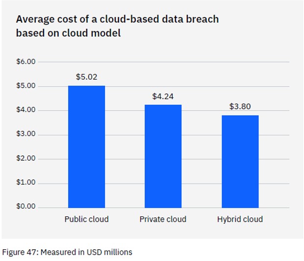 Breaches in the public cloud cost significantly more than those in a hybrid cloud. What is a hybrid cloud? It means that some data and processes are in a public cloud, and some are in a private cloud environment.